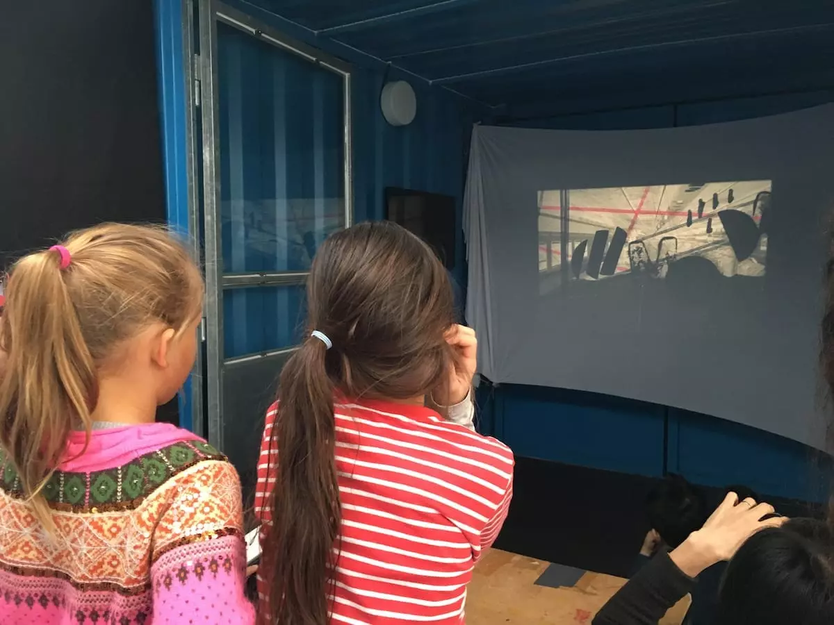 Der Glaspavillon re:use ist das erste, was wir vom Bauhaus-Archiv sehen, als wir uns vom Lützowplatz nähern. In dem lichtdurchfluteten Werkraum teilen drei blaue Container Nebenräume ab. Im großen Hauptraum mit zwei Gemeinschafts-Arbeitstischen erwartet Illustratorin und Kunstvermittlerin Doro Petersen gemeinsam mit einer Kollegin Kinder und Eltern zur bauhaus_werkstatt. Kostenlos können dabei Familien im Bauhaus-Archiv / re:use in den Wintermonaten jeden Samstag zwischen 11 und 14 Uhr Design-Experimente wagen.