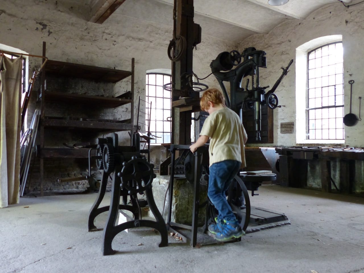 Dritte Station: Alte Schmiedewerkstätten, Ziegeleibahn-Ausstellung und – nächstes Highlight: ein Schienenfahrrad zum selber Treten.