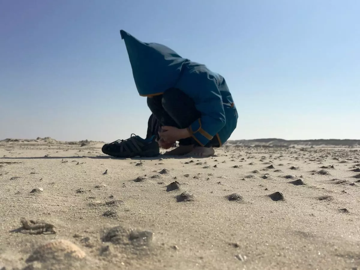 Dann radeln wir schnell durchs Dorf und vorbei am Flugplatz weiter nach Osten. Auf einem Deich ist die Radstrecke zu Ende. Von dort aus laufen wir durch die Dünen zum Strand. „Endlich Strand. Endlich an der Nordsee“, ruft mein Sohn und spricht mir aus der Seele.